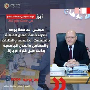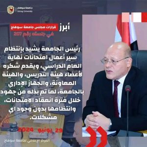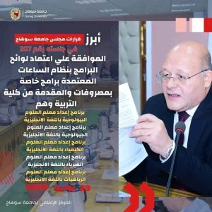 الرئيسية » أبرز قرارات مجلس جامعة سوهاج في جلسته رقم 207أبرز قرارات مجلس جامعة سوهاج في جلسته رقم 207بواسطة Shimaa rafat