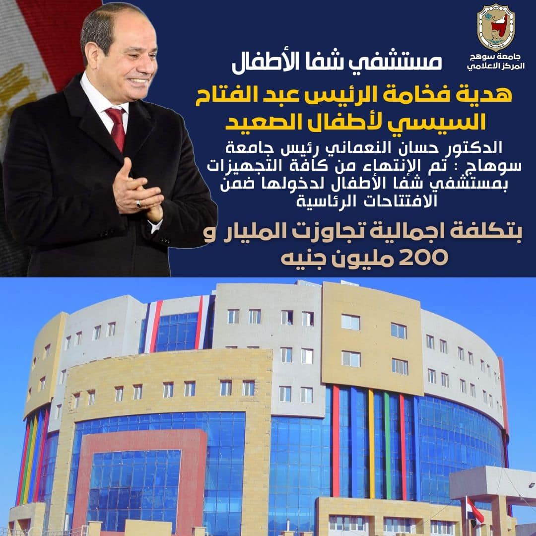 الرئيسية » بتكلفة تجاوزت المليار و٢٠٠ مليون جنيه ..مستشفي شفا الأطفال هدية فخامة الرئيس السيسيي لأطفال الصعيدبتكلفة تجاوزت المليار و٢٠٠ مليون جنيه ..مستشفي شفا الأطفال هدية فخامة الرئيس السيسيي لأطفال الصعيدبواسطة Shimaa rafat