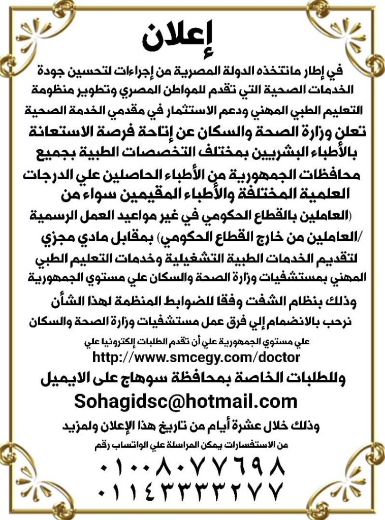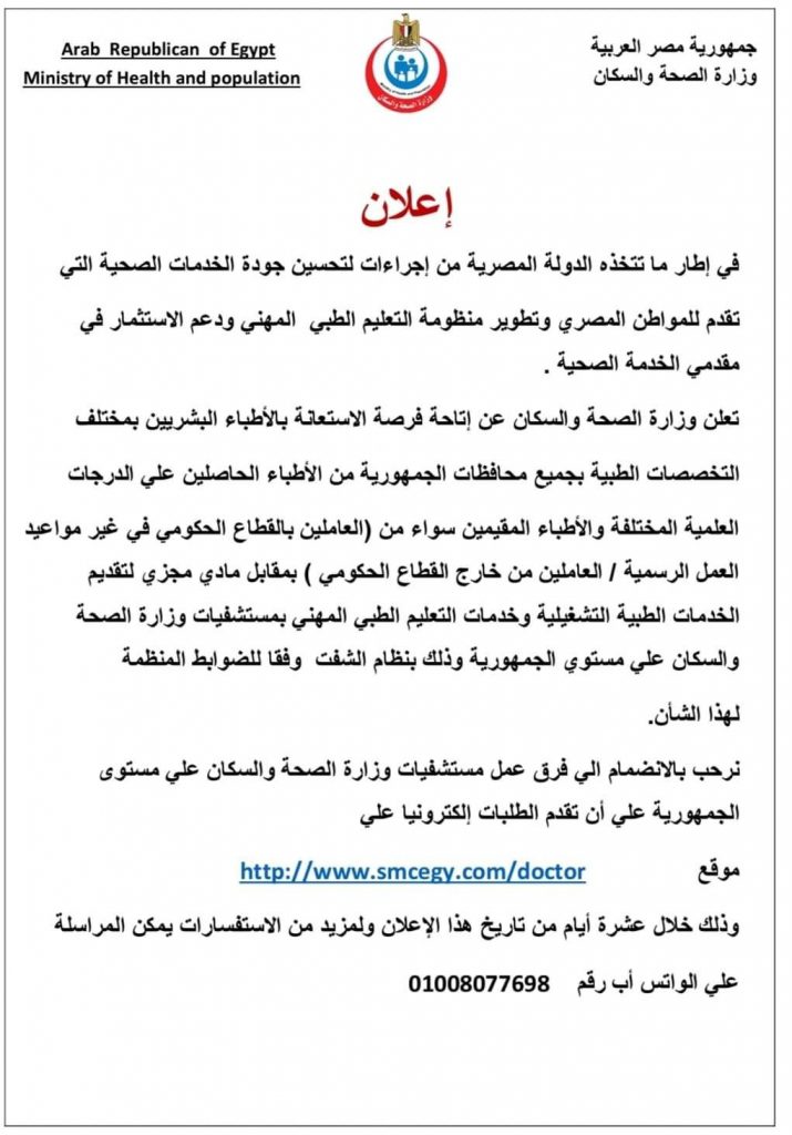تعلن وزارة الصحة والسكان عن إتاحة فرصة الاستعانة بالأطباء البشريين بمختلف التخصصات الطبية بجميع محافظات الجمهورية من الأطباء الحاصلين علي الدرجات العلمية المختلفة والأطباء المقيمين سواء من (العاملين بالقطاع الحكومي في غير مواعيد العمل الرسمية / العاملين من خارج القطاع الحكومي) بمقابل مادي مجزي بتقديم الخدمات الطبية التشغيلية وخدمات التعليم الطبي المهني بمستشفيات وزارة الصحة والسكان علي مستوي الجمهورية ، وذلك بنظام الشفت وفقا للضوابط المنظمة لهذا الشأن.
