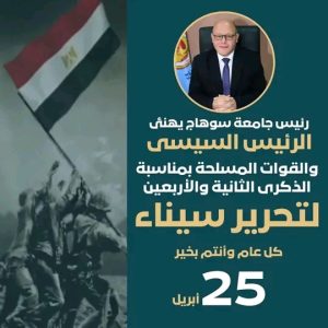 قدم الدكتور حسان النعماني رئيس جامعة سوهاج، التهنئة للرئيس عبد الفتاح السيسي رئيس جمهورية مصر العربية والقائد الأعلى للقوات المسلحة بمناسبة ذكرى تحرير سيناء ال42.