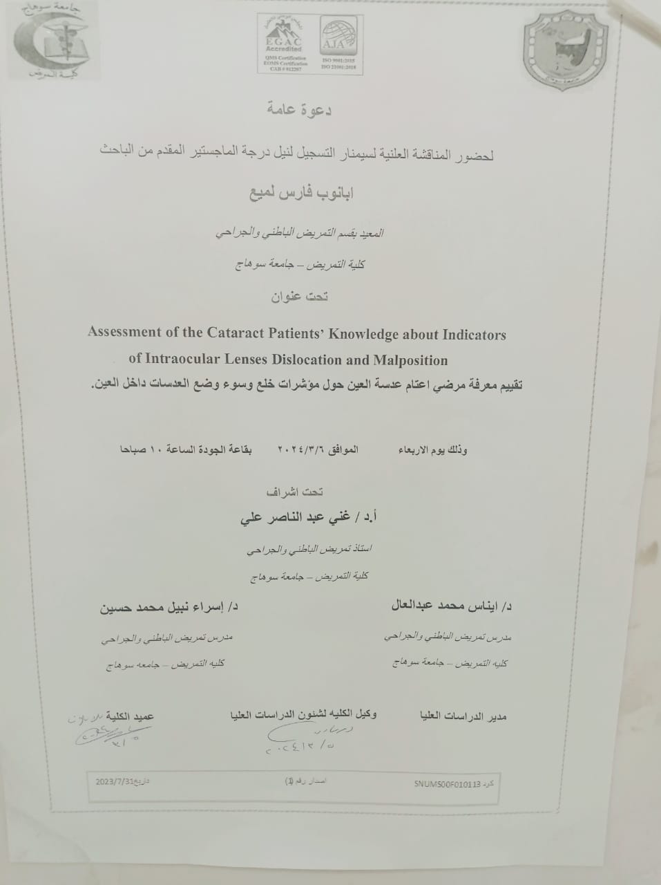 تحت رعاية السيدة الأستاذة الدكتورة/ غني عبدالناصر عميد كلية التمريض والسيدة الأستاذة الدكتورة/ نادية صالح وكيل الكليه لشؤون الدراسات العليا والبحوث ناقشت كلية التمريض سيمنار رسالة الماجستير الخاصة بالمعيد/ أبانوب فارس المعيد بقسم التمريض الباطني والجراحي بقاعة السيمينار بالكلية