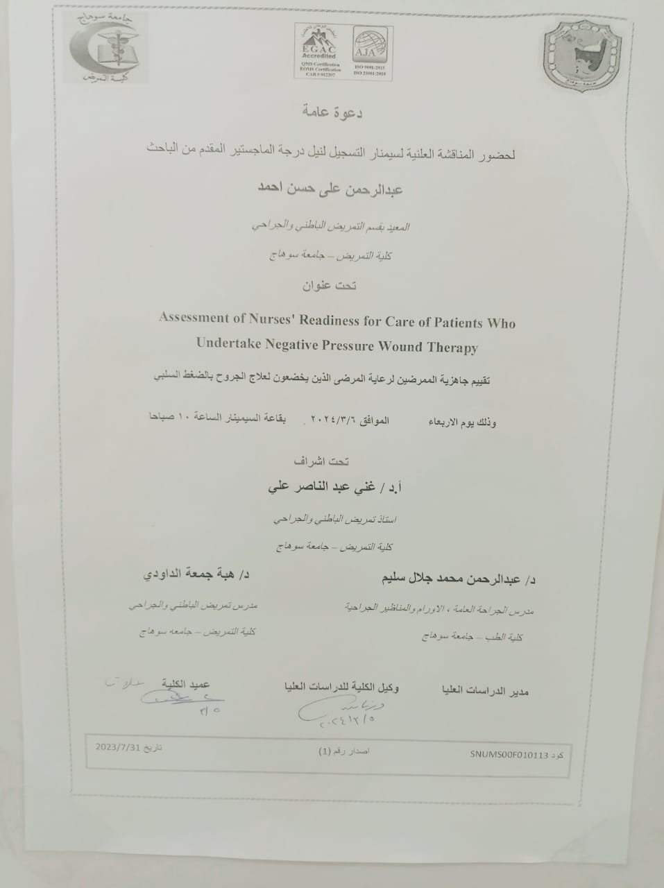 تحت رعاية السيدة الأستاذة الدكتورة/ غني عبدالناصر عميد كلية التمريض والسيدة الأستاذة الدكتورة/ نادية صالح وكيل الكليه لشؤون الدراسات العليا والبحوث عقدت كلية التمريض بجامعة سوهاج مناقشة سيمنار رسالة الماجستير الخاصة بالمعيد/ عبد الرحمن على حسن المعيد بقسم التمريض الباطني والجراحي بقاعة السيمينار بالكلية.
