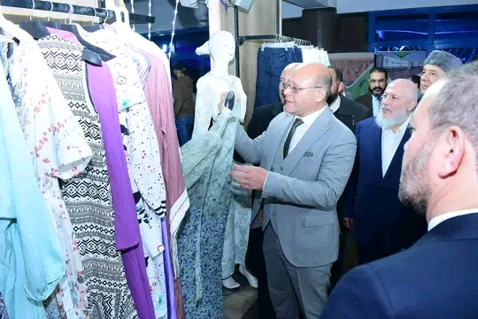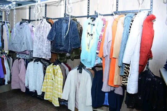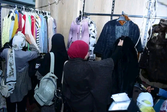 ان المعرض يضم عدد كبير من قطع الملابس والأقمشة مختلفة الأنواع، والتي يتم توزيعها على الطلبة والطالبات حسب المقاسات واختياراتهم للملابس.