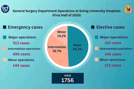 من جانبه أوضح الدكتور مجدي امين القاضي عميد كلية الطب البشري ورئيس مجلس إدارة المستشفيات الجامعية أن إجمالي عدد العمليات التي أُجريت بالقسم خلال هذه الفترة شملت عمليات كبرى ومتوسطة وصغرى، وتم تقسيمها إلى عمليات غير طارئة وعمليات طارئة، مما يدل على جاهزية الفرق الطبية للتعامل مع مختلف الحالات الجراحية على مدار الساعة