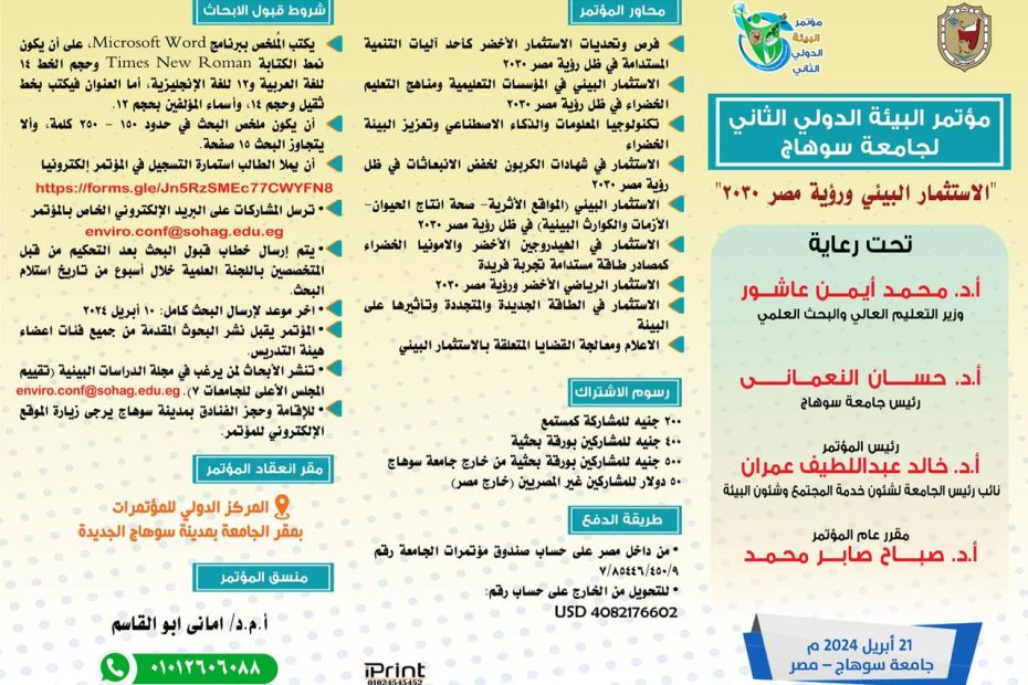 تحت رعاية الاستاذ الدكتور حسان النعمانى رئيس جامعة سوهاج والأستاذ الدكتور خالد عبد اللطيف عمران نائب رئيس الجامعة لشئون خدمة المجتمع وتنمية البيئة. تعقد جامعة سوهاج مؤتمر البيئة الدولي لجامعة سوهاج يوم 21 أبريل المقبل للمشاركة عبر رابط المؤتمر من هنا https://forms.gle/deR6GsdVzWLWqsVc7