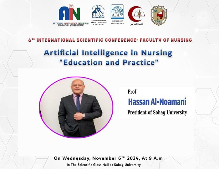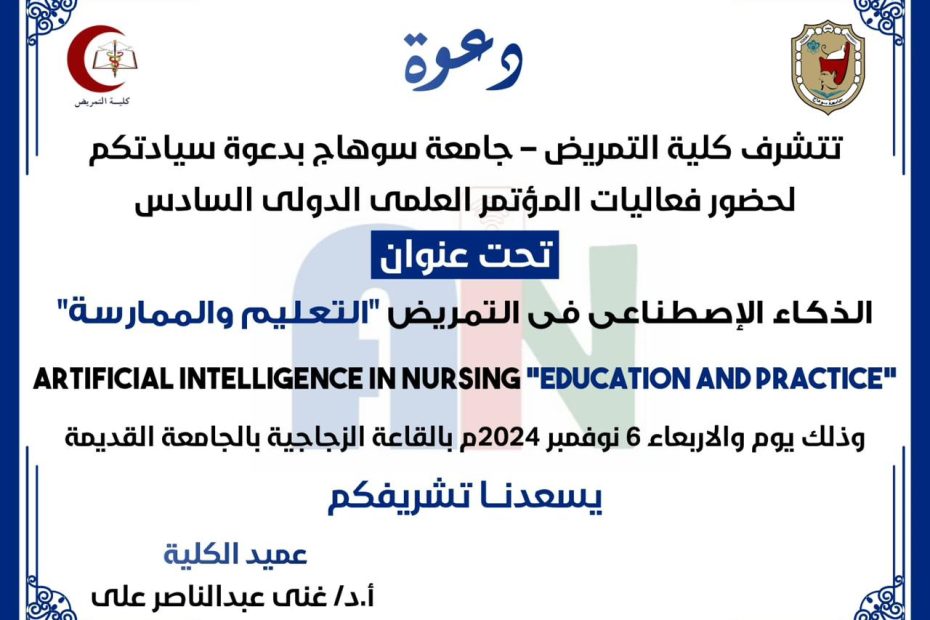 أعلن الدكتور حسان النعماني رئيس جامعة سوهاج، عن انطلاق المؤتمر العلمي الدولي السادس الذى تنظمه كلية التمريض بعنوان (الذكاء الاصطناعي فى التمريض “التعليم والممارسة”) ، وذلك الاربعاء الموافق 6 من نوفمبر الجاري بقاعة المؤتمرات الزجاجية بمقر الجامعة القديم. وأوضحت الدكتورة غني عبد الناصر عميد… اقرأ المزيد »مشاركه ٥ دول عربيه..انطلاق فعاليات المؤتمر الدولي السادس بجامعة سوهاج عن الذكاء الاصطناعي فى التمريض